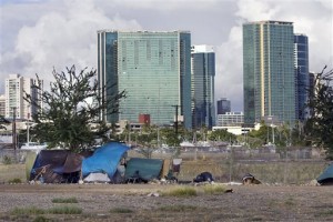 FILE – In this Monday, July 12, 2010 file photo, the Honolulu skyline rises behind a homeless camp in an empty lot near Kaakako Park, in Honolulu. Homelessness increased 15 percent on Oahu since last year according to a recent report. A growing number of homeless are not from Hawaii but make the most of their situation by taking advantage of inviting beaches and support services. State lawmakers are struggling with the visible problem of homelessness in tourist areas and some have proposed a contentious idea to use state money to fly the homeless back to wherever they came from. (AP Photo/Marco Garcia, File)