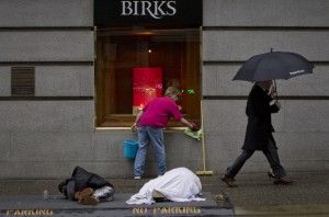 Pedestrians walk beside homeless people on Granville St. in downtown Vancouver, on Wednesday March 13, 2013. THE CANADIAN PRESS/Eric Dreger
