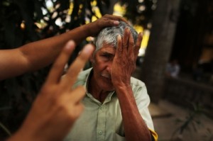 TEGUCIGALPA, HONDURAS – JULY 16, 2012: A homeless man is given a quick eye exam by a health worker from Doctors Without Borders on July 16, 2012 in Tegucigalpa, Honduras. Honduras now has the highest per capita murder rate in the world and its capital city, Tegucigalpa, is plagued by violence, poverty, homelessness and sexual assaults. With an estimated 80% of the cocaine entering the United States now being trans-shipped through Honduras, the violence on the streets is a spillover from the ramped rise in narco-trafficking.